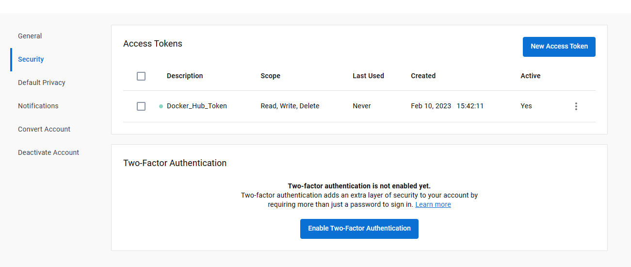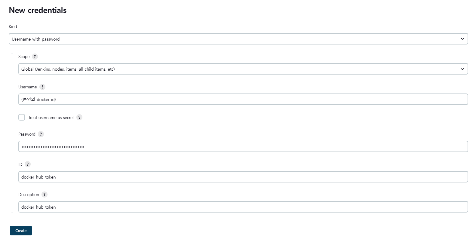 docker hub에서 만든 접근 토큰을 세팅해줍니다.